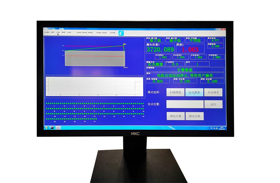 測量系統主界面中可以實時顯示被測板材的厚度值和橫向坐標值;掃描測量時統計半個掃描周期內的最大厚度、最小厚度、平均厚度等;測量模式可當前測量模式為掃描測量或定點測量;實時顯示被測截面的動態圖形;實時顯示測量數據動態波動趨勢。當測量數據在設定的范圍內變動時,數據呈現綠色;當測量數據超差(即超出設定的范圍)時,數據的顏色呈紅色,相應動態圖形輪廓超出最大/最小閾值。