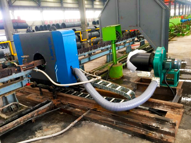 在線測徑儀配備了高壓鼓風機裝置,高壓離心通風機上裝有空氣過濾裝置,風機的出風口通過軟管向測徑儀輸送潔凈的冷風,以避免鋼材軋制過程中的水霧和氧化鐵皮進入測徑儀內(nèi)對光學系統(tǒng)測量產(chǎn)生干擾。