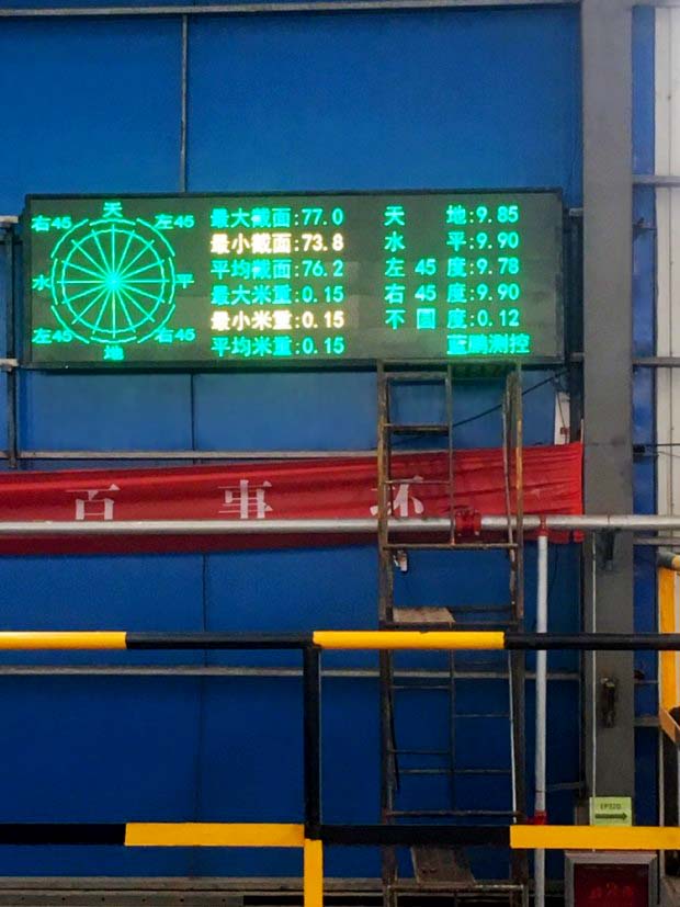 外接大顯示屏也做了一些改進,增添了顯示信息,最大截面、最小截面、平均截面、最大米重、最小米重、平均米重、天地、水平、左45°、右45°、不圓度等信息。通過外接大顯示屏同樣能看出超差與否。